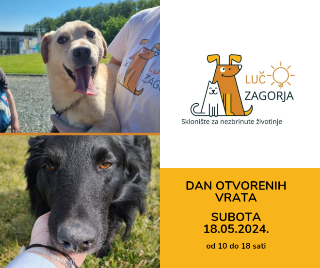 Sklonište za nezbrinute životinje Luč Zagorja iz Selnice ove subote, 18. svibnja, u vremenu od 10 do 18 sati, organizira Dan otvorenih vrata skloništa.